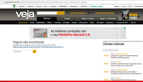 O fato é que, de repente, os vídeos da entrevista saíram do ar – pelo menos em sua fonte original. O texto se mantém no ar ( ), mas os vídeos desapareceram. Vejam só: nada no canal de Veja no YouTube ( ) e nada também no link original no portal da revista ( ).