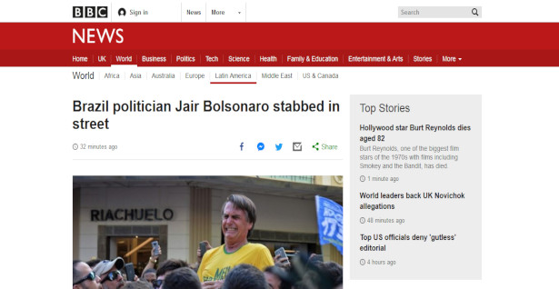 A rede britânica destacou o perfil do político, “controverso, que tem indignado muitos no Brasil com comentários racistas e homofóbicos”. O portal também ressalta a liderança de Bolsonaro nas pesquisas.