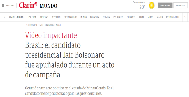 Na Argentina, o ressalta o perfil do candidato e dá ênfase para a repercussão que o atentado teve na mídia brasileira, gerando grande comoção da direita.