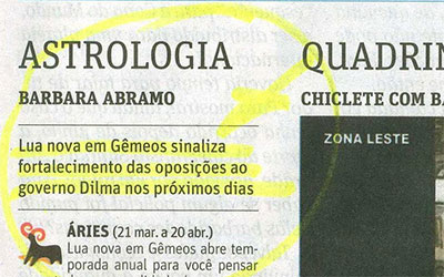 A jornalista Barbara Abramo, responsável pelas previsões astrológicas na Folha de S. Paulo , usou seu perfil no para desmentir que teria publicado na última quarta-feira (11/3) um horóscopo dizendo que haveria um "fortalecimento das oposições ao governo Dilma nos próximos dias", o que indicaria que as manifestações contra a presidente (15/3) seriam reforçadas pelos astros.
