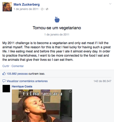 No post, o CEO do Facebook revela que decidiu-se pelo vegetarianismo como uma forma de dar mais valor à vida dos animais. Sem motivo aparente, os internautas brasileiros resolveram “brincar” com o fato e inundaram a postagem com com memes e brincadeiras.