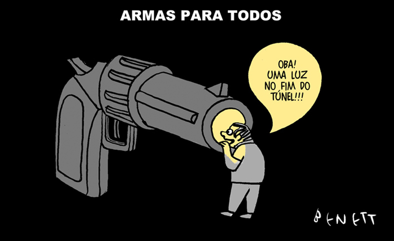 Segundo Benett, a charge abaixo tem um tom mais reflexivo. Ela foi publicada no Plural. “Armas, por exemplo, eu não gosto de fazer uma simples piada engraçada. Temas mais densos exigem charges menos simples, menos engraçadas. Mais críticas e muito mais reflexivas”, afirma.