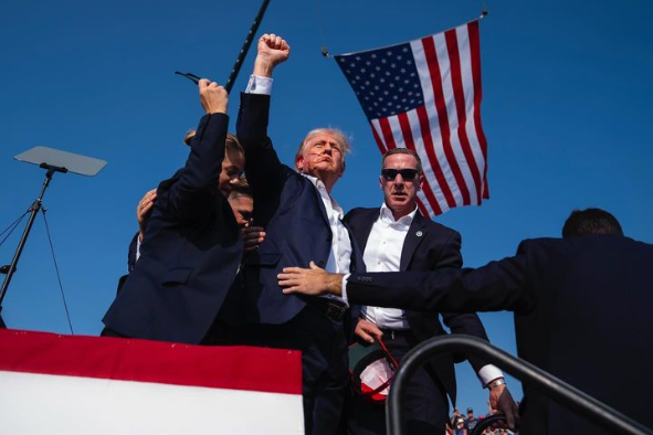Imagem feita por Evan Vucci é considerada a potencial foto do ano Atitude semelhante teve Evan Vucci, fotógrafo chefe da Associated Press, em Washington. Ele é o autor de outra histórica foto tirada no evento, que mostra Trump, com uma bandeira dos EUA tremulando ao fundo, com um dos punhos para o alto, enquanto é tirado do comício por agentes de segurança.