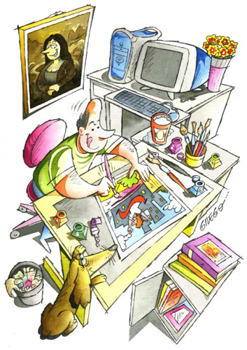 Entre essas inúmeras insatisfações, Grego diz que sua maior inspiração é o amor pelo trabalho e "o desejo de ver seu cliente sempre satisfeito". Cliente? Sim, Grego é ilustrador profissional e quer provar a quem encomenda seus desenhos que "a verba foi bem investida".