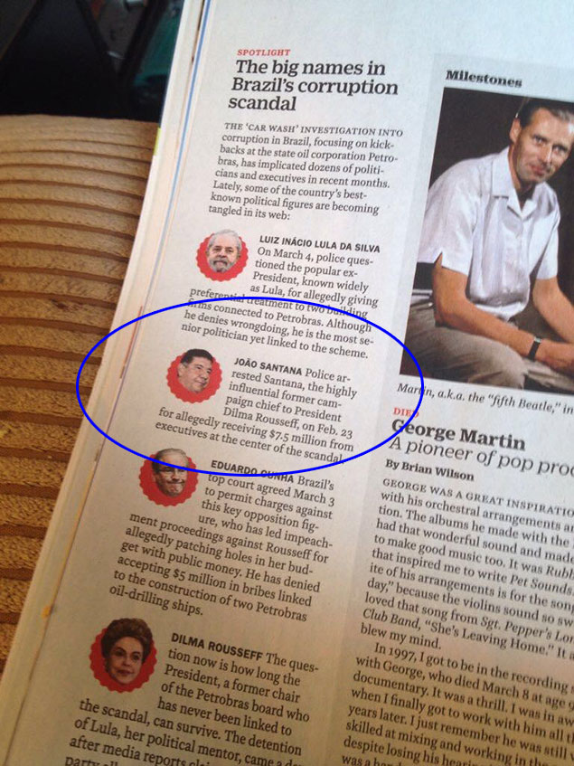 O texto intitulado " " ("Os grandes nomes do escândalo de corrupção no Brasil", em tradução livre), destacava políticos a biografia de implicados no esquema de corrupção na Petrobras.