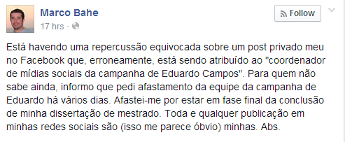 Bahealegou ter sido da campanha de Campos para se dedicar ao seu mestrado Procurada pelo jornal O Estado de S. Paulo , a assessoria de Campos, entretanto, informou que o profissional apenas solicitou afastamento no último domingo (8/6), após a repercussão de sua mensagem na rede social. Leia também: