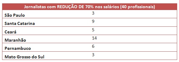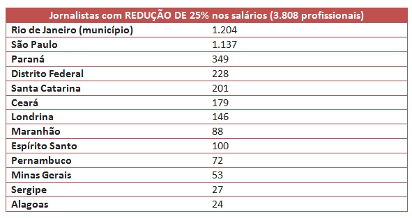 De acordo com a pesquisa, feita com as bases de 16 sindicatos da categoria no País e divulgada na quinta-feira (16), pelo menos 3.930 jornalistas com carteira assinada tiveram redução de salário e de jornada entre 25% e 70%.