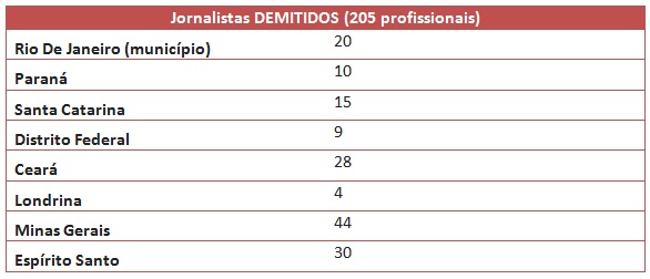 *Os números das bases de Pernambuco e Espírito Santo podem ser maiores pois os sindicatos receberam informações inconsistentes das empresas, como “grande parte da redação” ou “mais que 100”. As informações foram levantadas no município do Rio de Janeiro, no Distrito Federal, em São Paulo, Paraná, Santa Catarina, Ceará, Londrina, Maranhão, Espírito Santo, Pernambuco, Minas Gerais, Sergipe, Alagoas, Goiás, Mato Grosso do Sul e Paraíba, por meio do Departamento de Mobilização, Negociação Salarial e Direito Autoral da Fenaj.