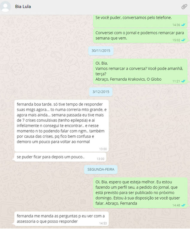 Em seguida, Bia pediu que as perguntas fossem enviadas para "ver com a assessoria o que posso responder". As questões foram enviadas e a neta de Lula disse que sairia para um ato político e que retornaria depois. Este foi o último contato entre ambas, três dias antes da acusação da neta de Lula.