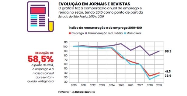 Segundo os números, de 2010 para cá, as redações de jornais e revistas de São Paulo diminuíram 58,5%. Dos 4.281 jornalistas contratados, restaram 1.777 em 2019. A remuneração média nesses veículos, calculada em R$ 6.883,59 no ano de 2019 já foi 11% maior.