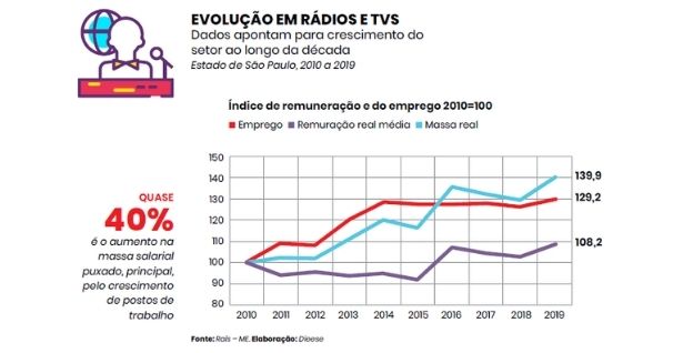 Já o total de jornalistas em rádio e TV cresceu 29,3% até 2019, com remuneração média de R$ 9.460,00, um aumento de 39,9%.
