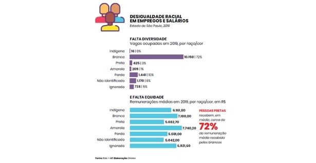 Assim como em setores como bancos e montadores, onde são pagos salários mais altos, no jornalismo levantamento do Dieese mostra que 72% dos contratados são brancos, e apenas 13% se identificam como pretos ou pardos.