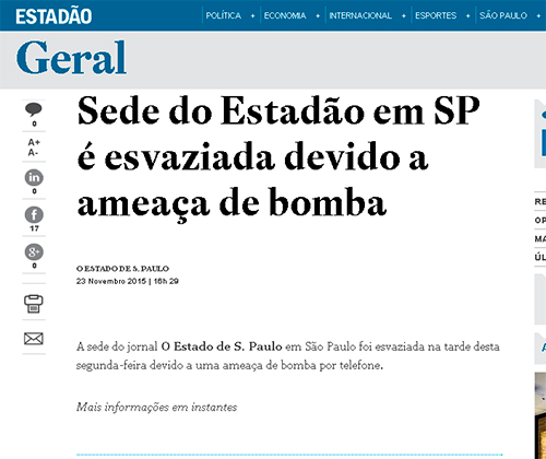 Prédio do "Estadão" é evacuado após ameaça de bomba