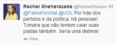 A jornalista Rachel Sheherazade e o humorista Fábio Porchat travaram uma discussão no Twitter na tarde da última quinta-feira (10/4). A troca de mensagens começou quando Porchat repercutiu a manchete do portal UOL, no qual destacava a declaração “Há pressão política muito forte para que eu seja calada”, atribuída à apresentadora.