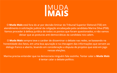 Já fora do ar, o Muda Mais no redirecionamento da página a medida do TSE e critica Marina Silva por tentar censurar o site. "Vamos proceder à defesa jurídica de todos os pontos que foram questionados, e não vamos deixar que as posturas anti-democráticas da candidatura nos calem. Marina precisa entender que na democracia ninguém fala sozinho. Tentar calar o Muda Mais é tentar calar o debate político", informou.