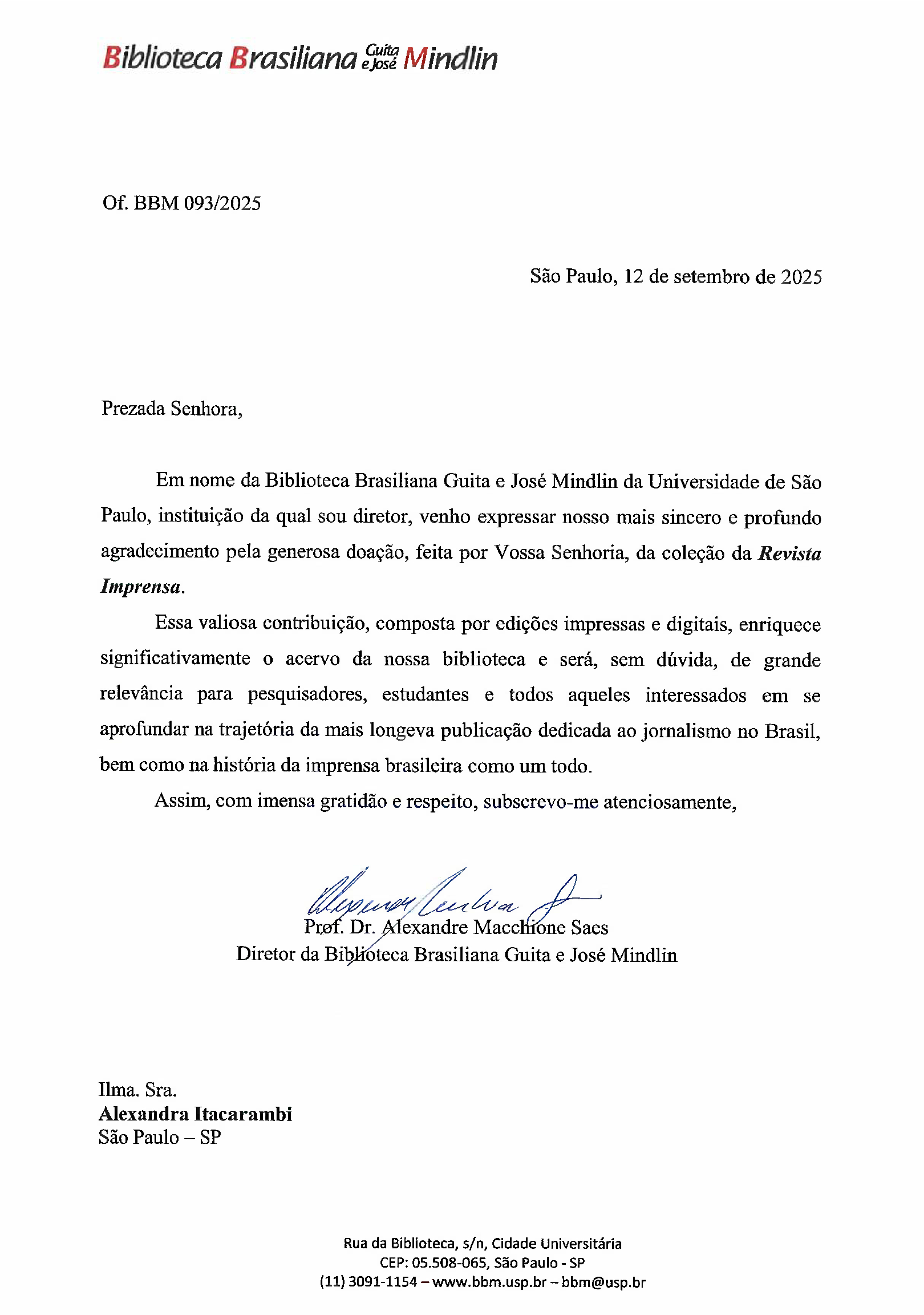 Essa valiosa contribuição, composta por edições impressas e digitais, enriquece significativamente o acervo da nossa biblioteca e será, sem dúvida, de grande relevância para pesquisadores, estudantes e todos aqueles interessados em se aprofundar na trajetória da mais longeva publicação dedicada ao jornalismo no Brasil, bem como na história da imprensa brasileira como um todo.