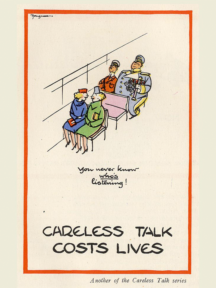 Mas uma que foi utilizada, e fez sucesso, era centrada na frase ‘Careless Talk Costs Lives’, que buscava alertar para o risco de tagarelas acidentalmente passarem segredos militares para o inimigo, com consequências devastadoras.